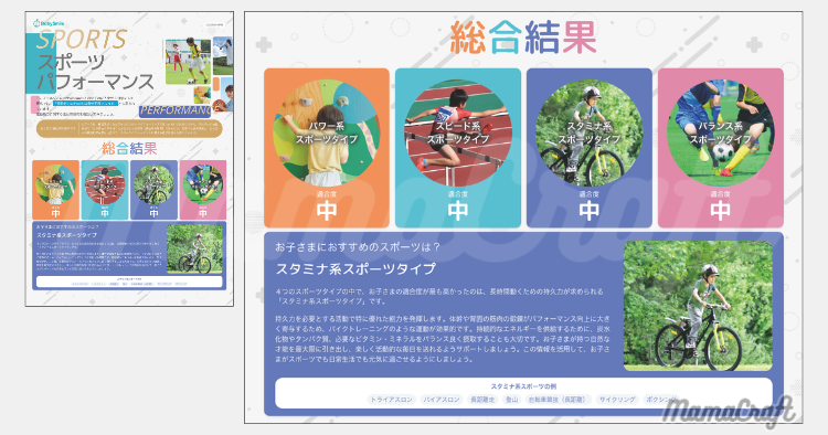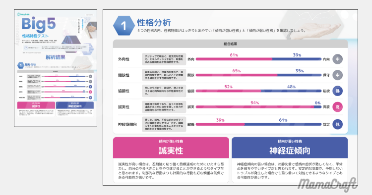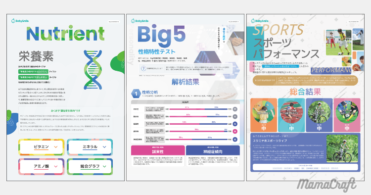結果項目を総合して、「性格特性(Big5 性格特性)」「スポーツパフォーマンス」「栄養素」の3つのまとめレポートがもらえます!生活・育児に活かしやすいレポートになっています!